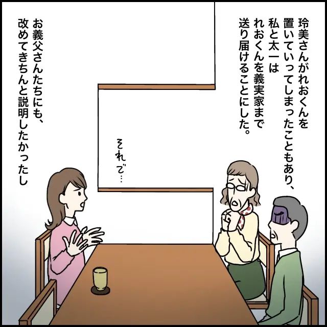 玲美さんがれおくんを置いていってしまったこともあり、私と太一は、れおくんを義実家まで送り届けることにしました。玲美さんにされたことについても、義両親にきちんと伝えておきたかったので、ちょうどよかったです。私の話を聞き終えた義両親は、みるみる顔色を失い、真っ青になっていました。
