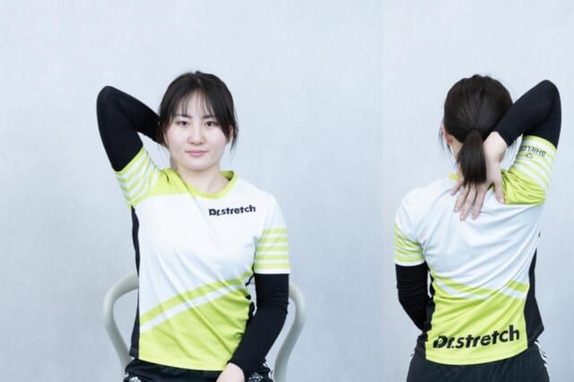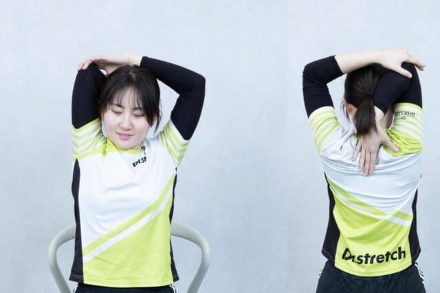 (3)右ひじを左手で掴み、左手でぐっと右ひじを押して心地よい伸びを感じながら10〜15秒間キープする
