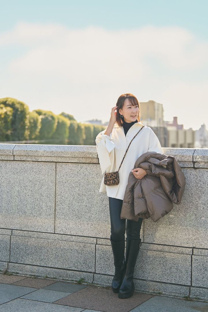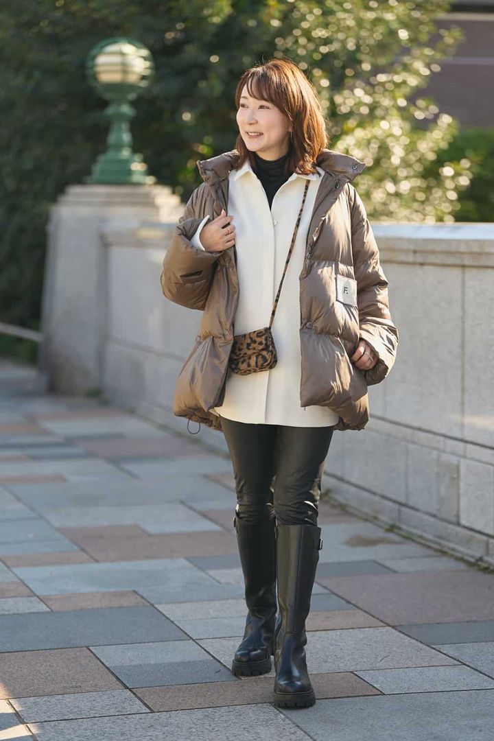 「軽さ、暖かさ、洒落感と、大人が求める条件を満たす一着に即決。ダウンとは思えないほど軽やかな着心地と洗練されたデザインに惹かれました。袖下のファスナーを開けばポンチョ風にも着られ、印象に変化を。今季トレンドのブラウンは柔らかい印象で品よく見せてくれます。大きなリボンの付いた白シャツのボリューム袖を覗かせ、黒のパンツとブーツで引き締め、ヒョウ柄ミニポシェットで遊び心をプラスしました」
