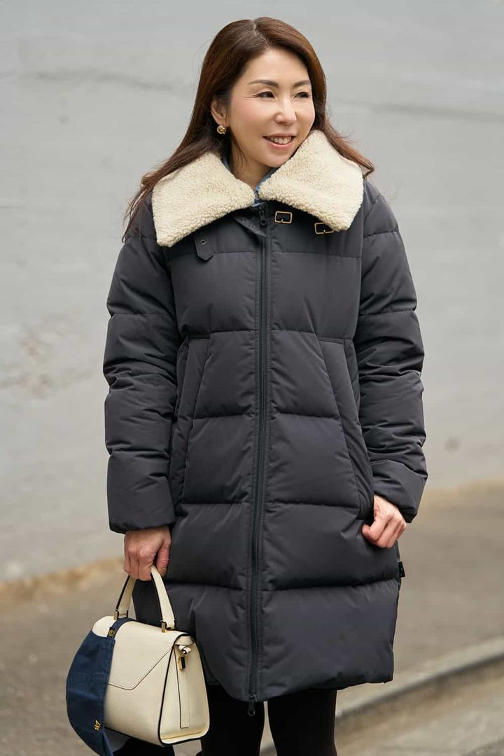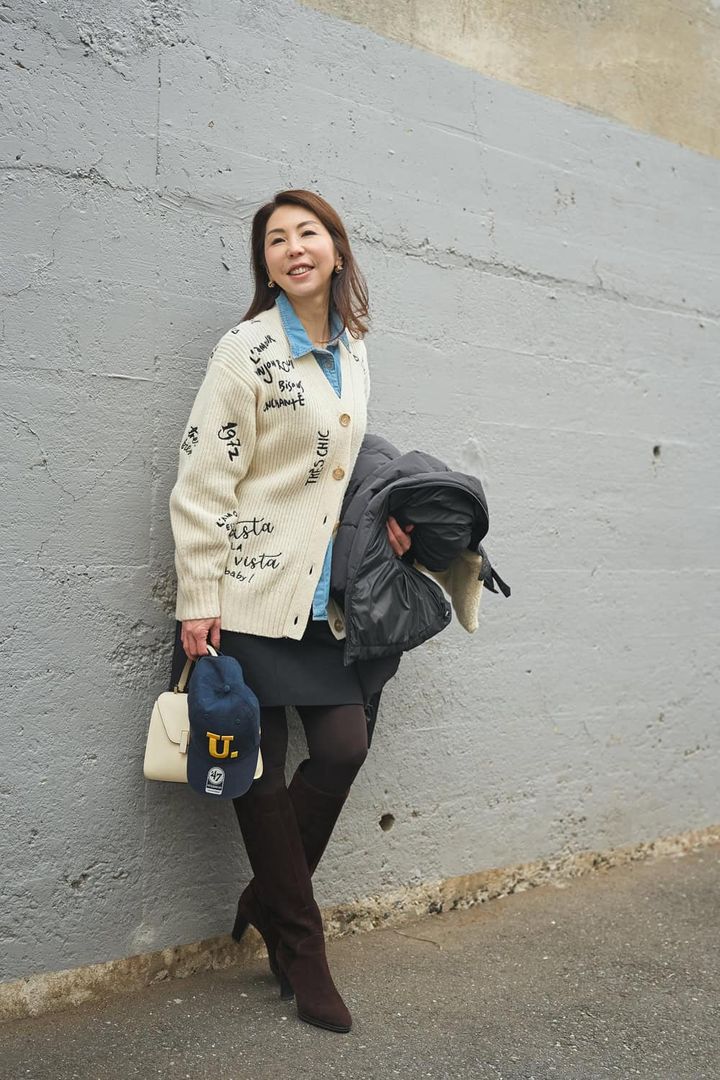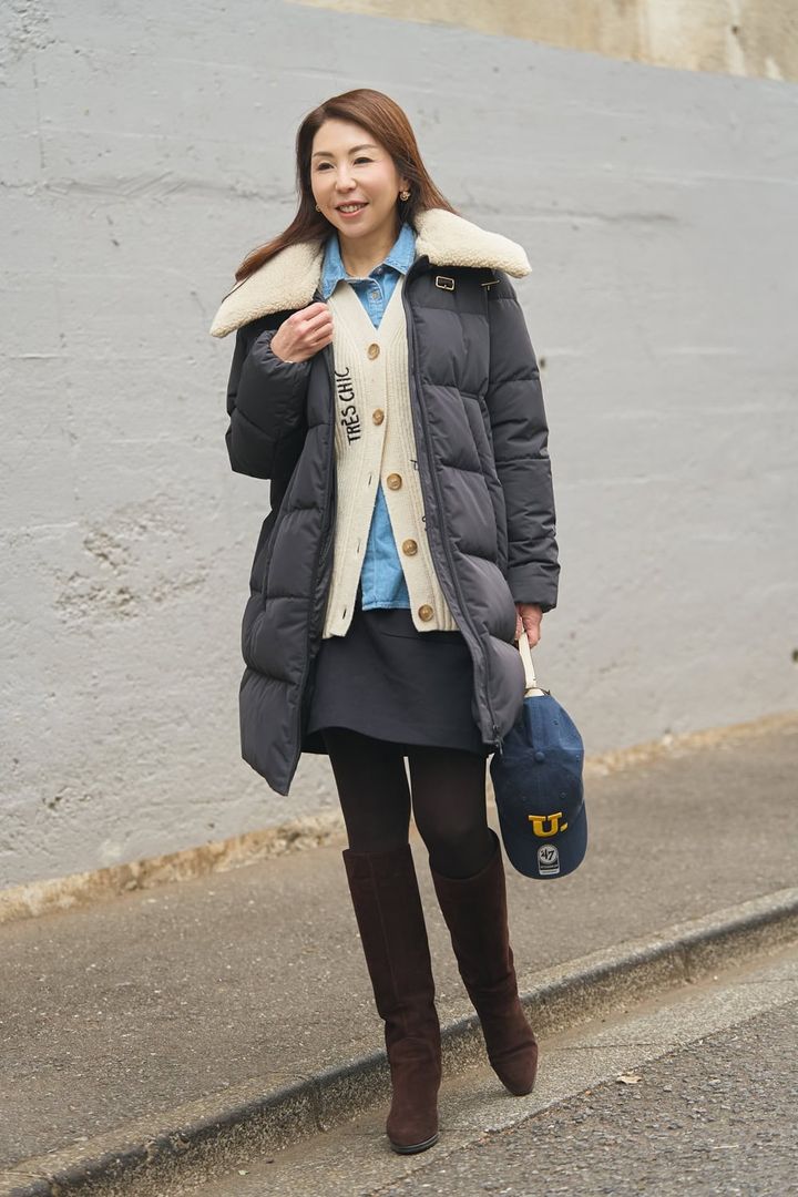 「黒のダウンはすでに持っているため、今年はネイビーを選びました。息子のサッカーの応援や真冬の韓国旅行で着るために派手になり過ぎないシックなデザインを。シックな色でも襟の白ボアが顔まわりを明るく見せてくれます。コーデが地味にならないように、ダウンの下には英字刺繍カーディガンを合わせ、重く見えがちな冬スタイルを華やかにまとめました」