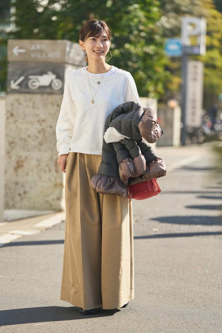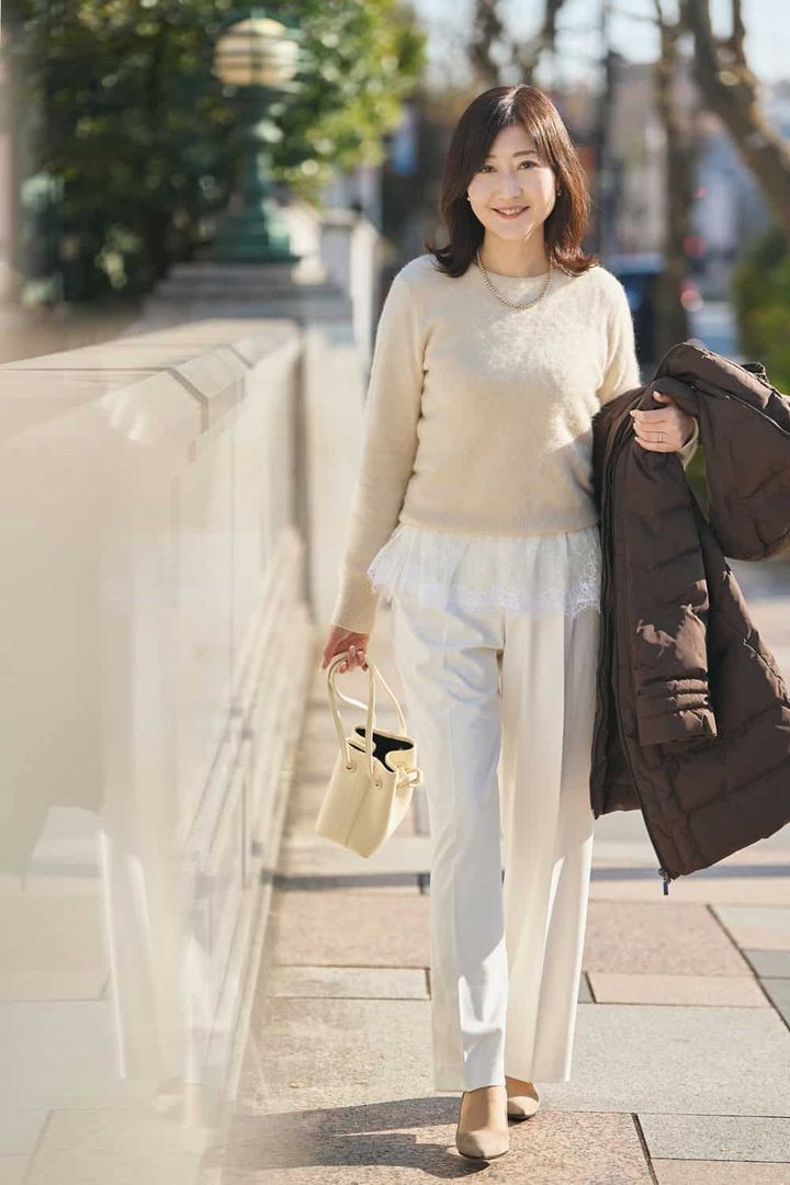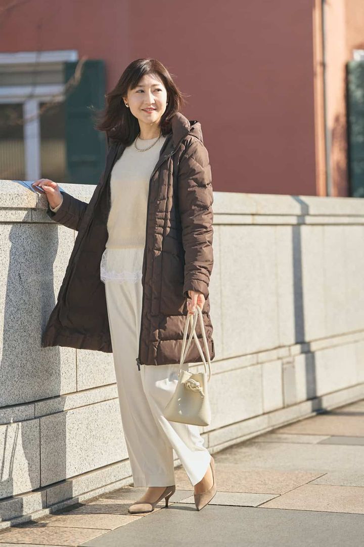 「細身のシルエットでもしっかり防寒でき、ロングの丈でも重く見えないバランスのよさがマッチしました。スカートにもパンツにも合わせやすいのが魅力。ブラウンは印象を優しく見せつつ、落ち着いた大人の抜け感を演出してくれます。手持ちの服とも相性がよく、レースをレイヤードしたオールホワイトコーデのきちんと感をダウンで和らげました。ダークトーンになりがちな冬に、抜け感をプラスしてくれる1枚です」