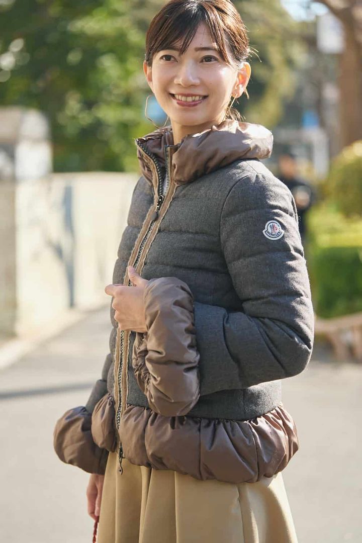 「グレー×ブラウンの配色が斬新で一目惚れしました。全体的にコンパクトながら、裾と襟の構築的なデザインが派手になり過ぎず程よい存在感を演出してくれます。アウターで色を取り入れることで冬のマンネリから脱却。ダブルジップ使用なので開け方次第で表情を変えられてコーデのバランスが決まりやすい。コンパクトなダウンと相性のよいワイドパンツに赤バッグを合わせ、メリハリを付けました」
