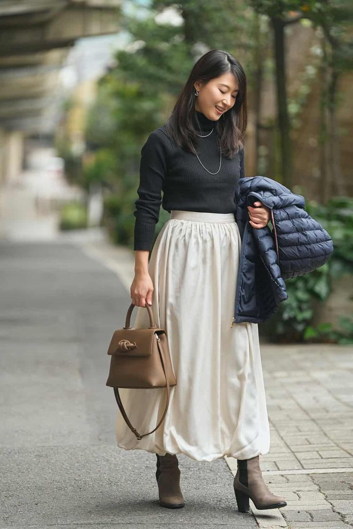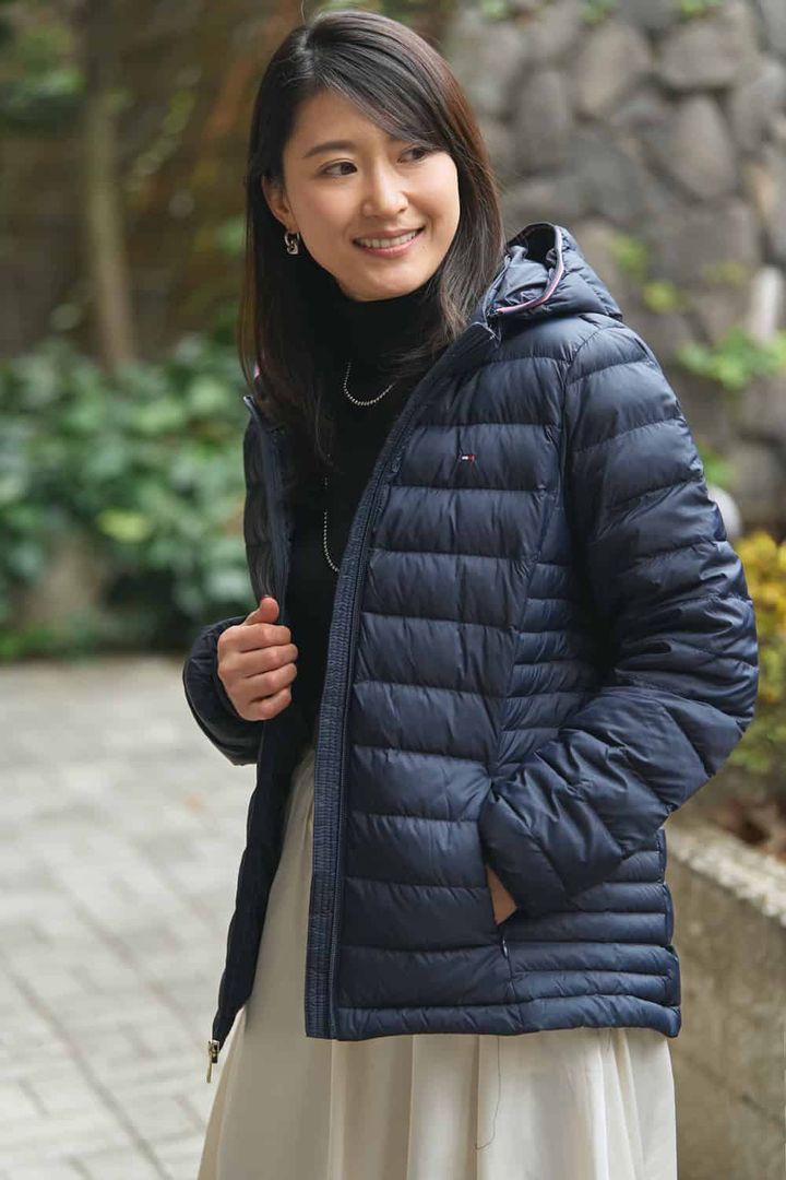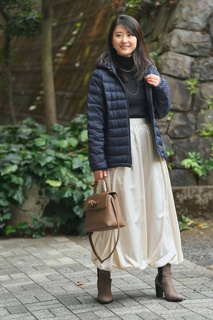 「ワンマイルコーデにサッと羽織れるライトダウンを探していた時に出合った一着。ショート丈で程よくウエストシェープされているので着膨れせず、すっきりとした印象に見せてくれます。ダウンはカジュアルになりがちなので、上品できちんと感のあるネイビーをセレクト。ツヤのあるサテンのバルーンスカートを合わせても上品さはキープされたまま甘スタイルを楽しめ、幅広いスタイルに馴染む万能ダウンです」
