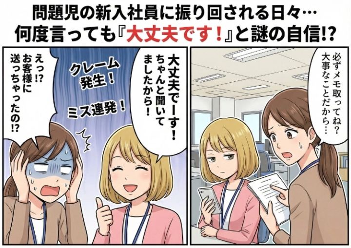 入社して数年が経ち、仕事にもすっかり慣れてきた私は、今年初めて新入社員の指導係を任されることになりました。「どんな子が来るんだろう」と張り切っていましたが、配属された後輩は予想外の問題児。挨拶は小さな声でボソボソ、教えた業務は翌日には綺麗さっぱり忘れてしまうのです。とはいえ、「最初は誰でも失敗するものだから」と、まずは根気強く教えようと楽観的に考えていました。