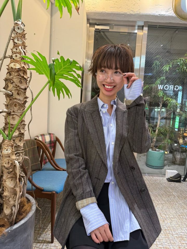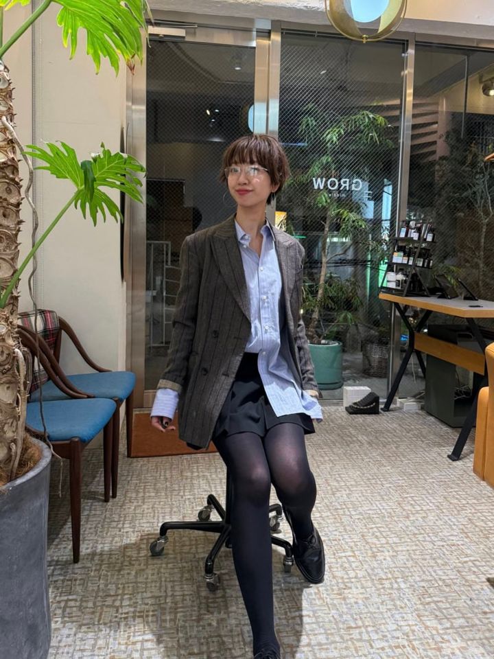 「トレンドのミニスコートに、ダブルジャケットをあわせてバランスよくまとめました。中に着たシャツはChaosのもの。春を意識して水色を選び、明るい雰囲気に! アイウェアを取り入れて、コーデのアクセントにしました」(美容師・丸岡奈央さん)