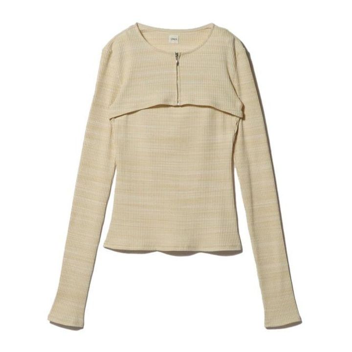 「ユナス」は、徹底した素材選びにこだわり、日常使いのアイテムから投資価値のある上質なウエアまで幅広く展開するブランド。今回お届けするのは、ノースリーブとロングスリーブがセットになったコンビネーションカットソー。