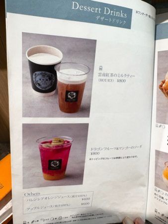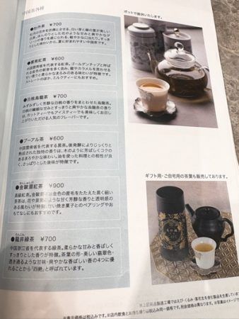 牡丹茶、雲南紅茶、白桃烏龍茶、プーアル茶、金駿眉茶(きんしゅんぴちゃ)。白桃烏龍茶が人気でおすすめとのことでそれをチョイス。