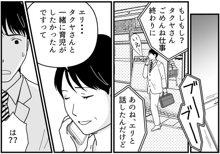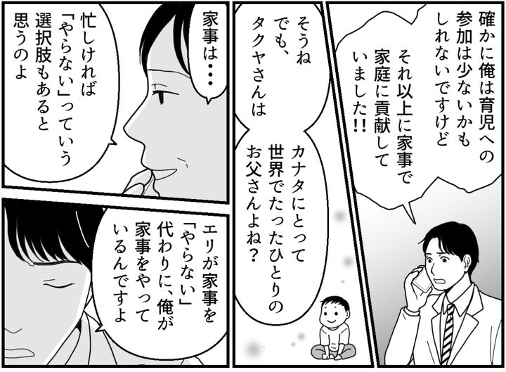 俺(タクヤ)は、妻のエリと2才の息子・カナタを育てている。エリが職場復帰を果たしてから、わが家は大忙しな日々。だから俺はできるだけ家事を頑張ってきた。エリは俺が頼んだ少しの家事すらもできないのに、一緒に公園へ行けと言う。俺がエリの負担を軽くしているんだから、もっと気を利かせるべきなのに……。そう思っていたら、エリがカナタを連れて家を出ていった。電話を何度もかけたがエリは出ない。どうやらエリは実家にいるようだ。