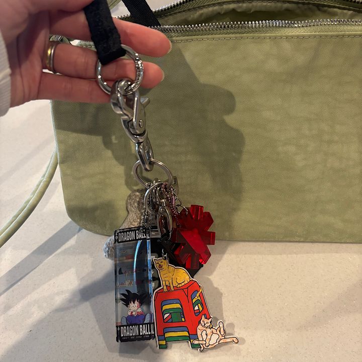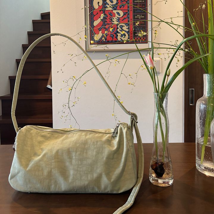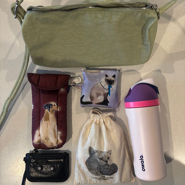 バッグとサングラスケースとエコバッグは全てbagguのもの。エコバッグのミニサイズは常備、食料品の買い出しがあるときは普通サイズも持ち歩いています。カードケースがbalenciaga、色々詰め込んでる巾着は大好きなカフェpretty thingsのもの、それと最近持ち歩き始めたowalaのマイボトル!