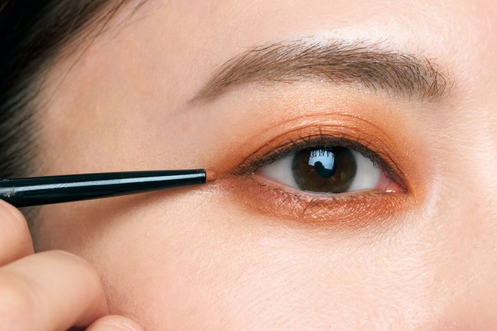 オレンジシャドウを細めのブラシにとり、上瞼のキワ(目頭から目尻まで)と下瞼のキワ(黒目の下から目尻まで)に塗ります。