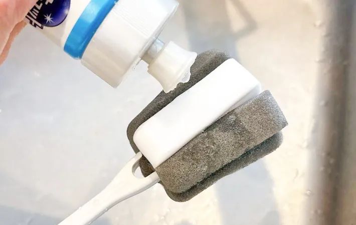 まず、スポンジに食器用洗剤を含ませます。柄つきが洗いやすくておすすめです!