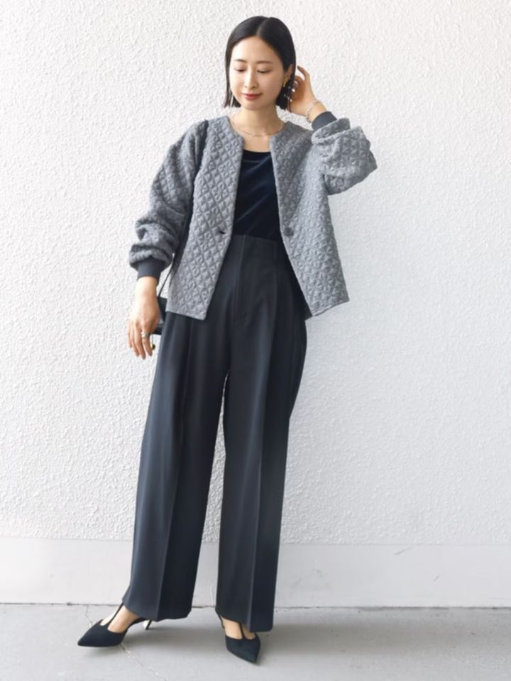 ジャケット風のきれいめなカーディガンは、パンツにもスカートにも合わせやすく、シーンを問わず着られるのがうれしい。