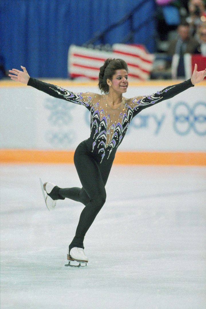 ブラックとパープルのレトロなジャンプスーツでカルガリー五輪の試合に臨んだ、アメリカ人選手デビ・トーマス。ヘアとメイクにより、この見事な80sファッションが一層際立っている。