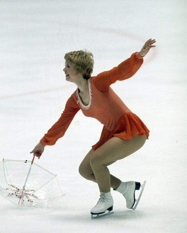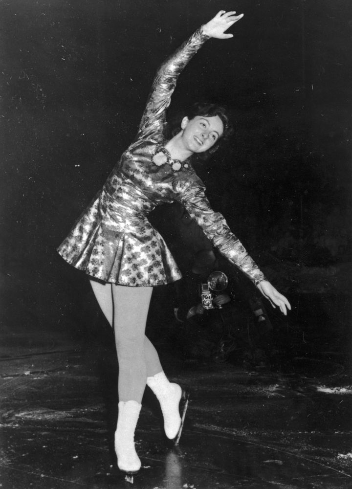 英国人スケーター、ジャネット・アルトウェッグ選手は、プリント入りのサテンのボックスプリーツスカートを着用し、金メダルを獲得。