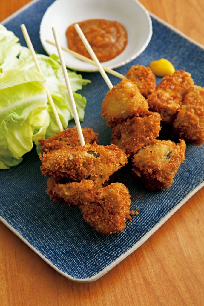 こんにゃくのイメージが変わる、串カツ風フライ。冷凍するひと手間で、食感はまるでお肉のよう。ひと口食べれば、その違いにきっと驚きます。みそだれやソースをつけてめしあがれ♪