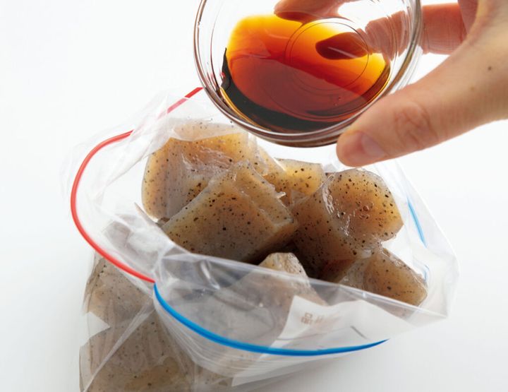 (2)冷凍用保存袋にこんにゃくを入れ、めんつゆ(3倍濃縮)大さじ1を加えて袋の上からもんでなじませる。袋の空気を抜いて口を閉じ、冷凍庫に入れて凍らせる。冷凍した状態で1カ月保存OK。