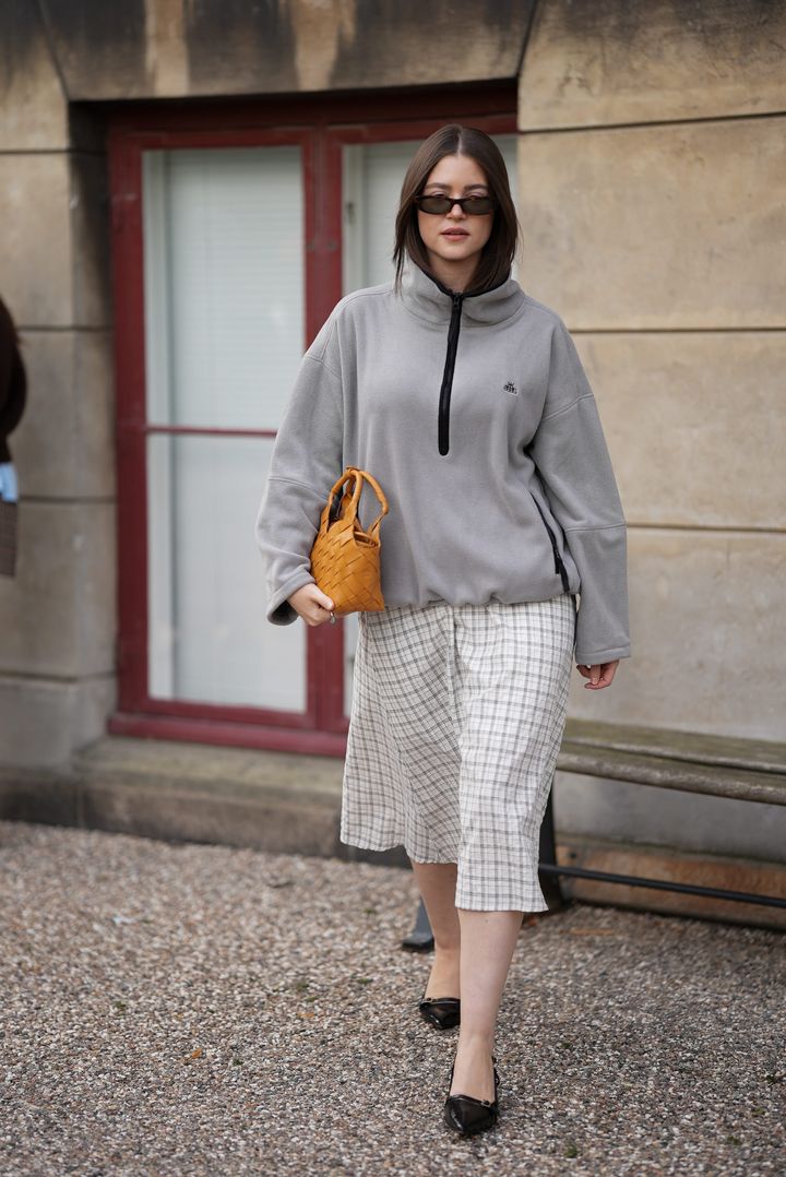 まだしばらくは肌寒い日が続くので、暖かなフリース素材のハーフジップトップもおすすめ。アウトドア色の強いフリーストップですが、あえてフェミニンなミディスカートやパンプスを合わせるのが今どきなバランス感。