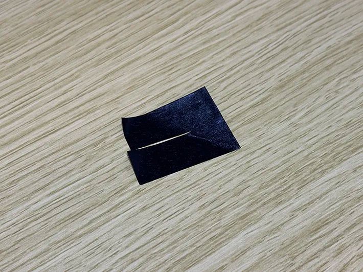 マスキングテープを裏返し、黒い三角形の大きさを真似るよう、左右の粘着部分も三角にカットします。