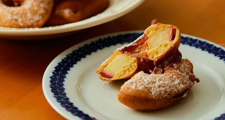 「特にカーニバルの時季に食べるお菓子は揚げ菓子が多く、これもそんな一つなんですよ」と、山内千夏さんが話すように、りんごに生地をからめて油で揚げた、ボリューミーなお菓子。衣が薄いと天ぷらのようになってしまうので、ベーキングパウダー入りの生地でドーナツのようにふっくらと揚げるのがポイントだ。揚げ上がりにうっすらと見える、りんごの皮の赤いラインもかわいらしい。りんごをよく食べる地域ということもあり、ほかのフルーツでつくることはなく、りんごのためのお菓子なんだそう。