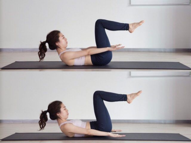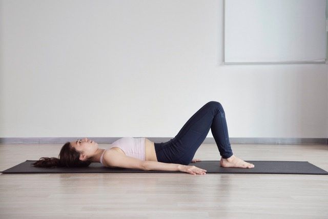 (1)仰向けに寝て両ひざを立てて両足を揃え、一旦息を吸って、息を吐きながら骨盤をやや後に倒してお腹に力を入れて凹ませる