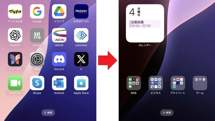 そんなときにおすすめなのが、アプリをフォルダにまとめて整理する方法です。 フォルダはアイコンを重ねるだけで簡単に作成でき、「買い物」「SNS」など大まかなジャンルごとに分けると、使いたいアプリがぐっと見つけやすくなります。