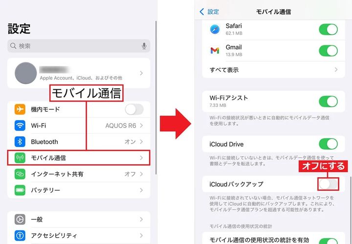 さらに、外出時に不要なデータ通信を防ぐため、「モバイル通信」設定内の「iCloudバックアップ」をオフにし、Wi-Fi接続時のみバックアップするように変更するのもおすすめです。これらの細かな設定の積み重ねが、快適な利用につながります。