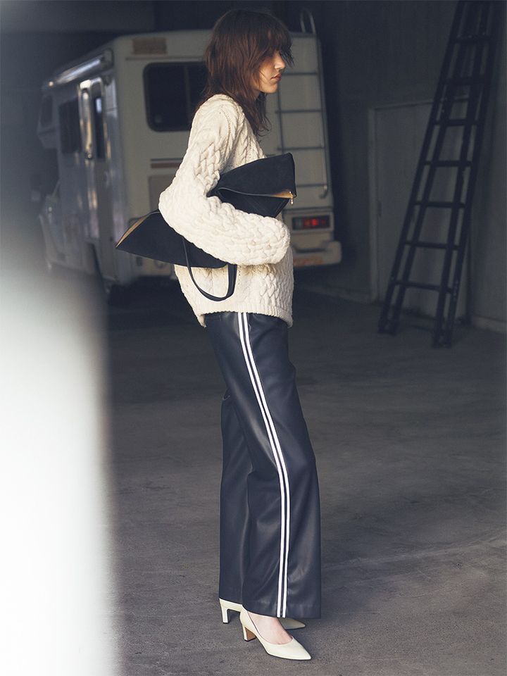 【POINT】スポーティなエッセンスをとり込んで美脚見えするレザーをカジュアルダウン。黒ほど無骨に見えないネイビーが、ざっくりとした白ニットに寄り添うやさしい切れ味に。
