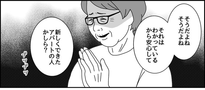 奥さんは小さな声で、「だったら……新しくできたアパートの人かしら……」と、ブツブツ言っています。