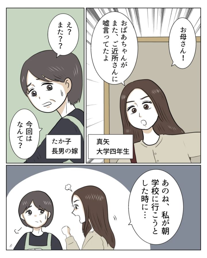 私はたか子。夫と大学生の娘、高校生の息子、そして義母と同居しています。ある日、学校から帰ってきた娘の真矢が「お母さん!おばあちゃんがまたご近所さんに嘘言ってたよ」と教えてくれました。「え?また??」こんなことはもう慣れっこですが、どんなことを言っていたのかはちょっと気になります。「今回はなんて?」と聞くと、真矢が今朝あったことを話してくれました。
