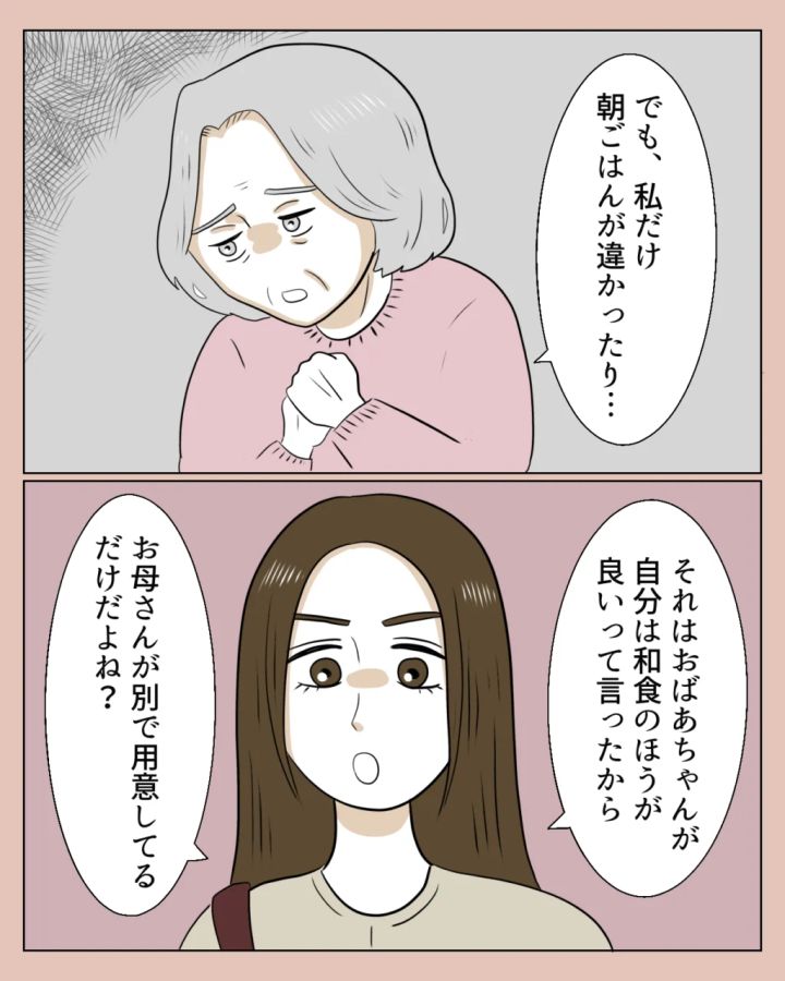 それでもお義母さんは「でも、私だけ朝ごはんが違ったり・・」とまるで自分が家で嫌がらせをうけているかのように悲しそうに言うので、「それはおばあちゃんが自分は和食のほうが良いって言ったから、お母さんが別で用意してるだけだよね?」と誤解されないように真矢が言ってくれたそうです。