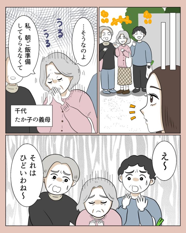 真矢が家を出ると、お義母さんがご近所さんに「私、朝ごはん準備してもらえなくて」と泣きながら話していたそう。ご近所さんは「え~」「それはひどいわね~」と同情。
