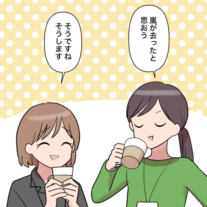 「嵐が去ったと思おう」そう話す藤澤さんに、私は笑顔で「そうですね、そうします」と頷きました。今回の田中さんの件は、まさにもらい事故のようなもの。どれだけ気を付けていても、向こうから来られたら避けようがありません。だからこそ気にしないのが一番。こうしてようやく、私のもとに平穏な日々が戻ってきたのでした。