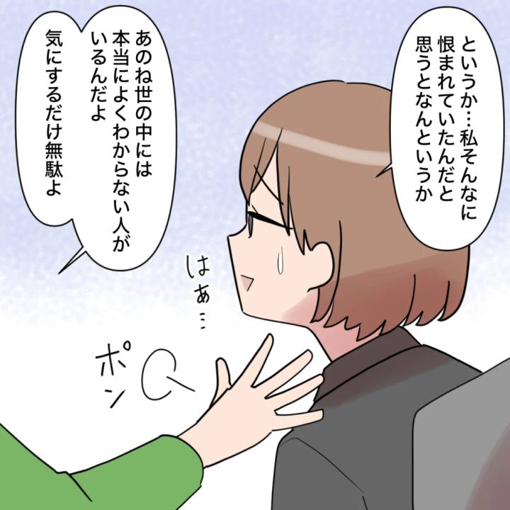 「というか・・・私そんなに恨まれていたんだと思うとなんというか」そう言ってため息をつくと、藤澤さんは私の肩をポンと叩き、「あのね、世の中には本当によくわからない人がいるんだよ、気にするだけ無駄よ」と、やさしくフォローしてくれました。