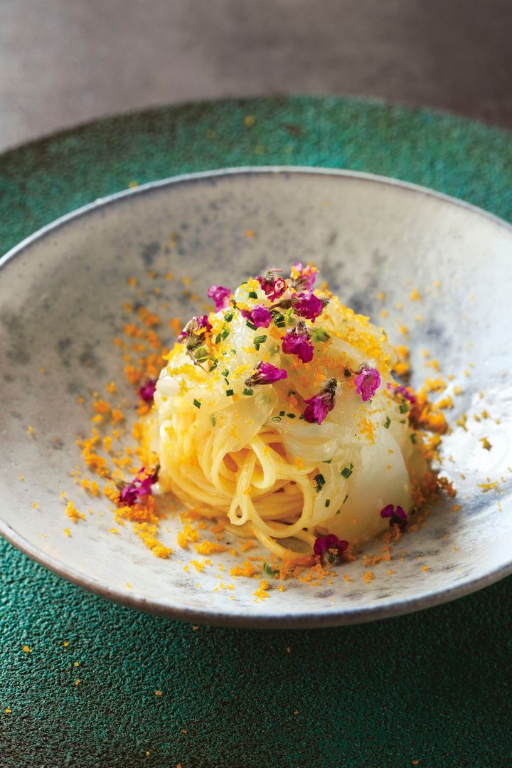 パスタは「揖保乃糸」を手掛ける会社が作る麺を使用。細い麺は具材とよく絡む。カラスミ、墨いか、レモン汁でさっぱりといただく。 撮影=前川明範