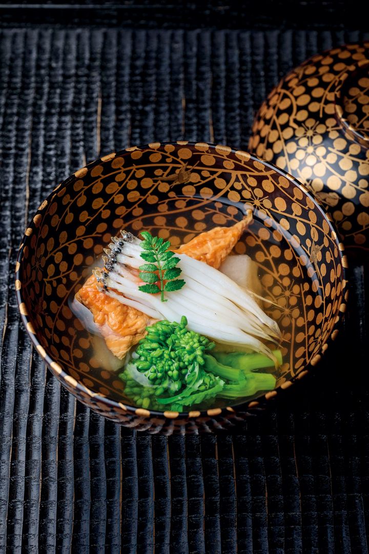 蕪の葛豆腐にばちこの塩気が効いた「橦木町 しみず」の椀。白魚は桑名産。出汁は真昆布と利尻昆布を合わせたまろやかな大阪仕込み。 撮影=阿部 浩