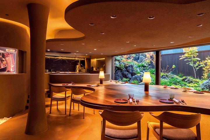 自然の美しさを表したような優美な空間も話題。窓の向こうには滝が流れる日本庭園が造られ、食事の時間をさらに特別なものに演出している。 撮影=前川明範