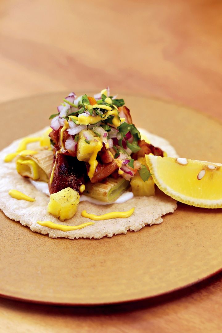 タコス。地元のブランド地鶏「岡崎おうはん」の親鶏と、「飛驒一本ねぎ」を薪で焼き、ペルーの薬味を添える。仕上げはパイナップルソースでまろやかに。 撮影=安田慎一