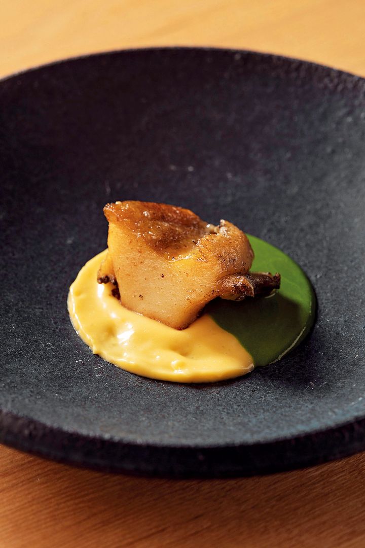 柔らかい鮑は春菊と、かぼちゃを使った味噌で仕立てた2種のソースで。 撮影=前川明範