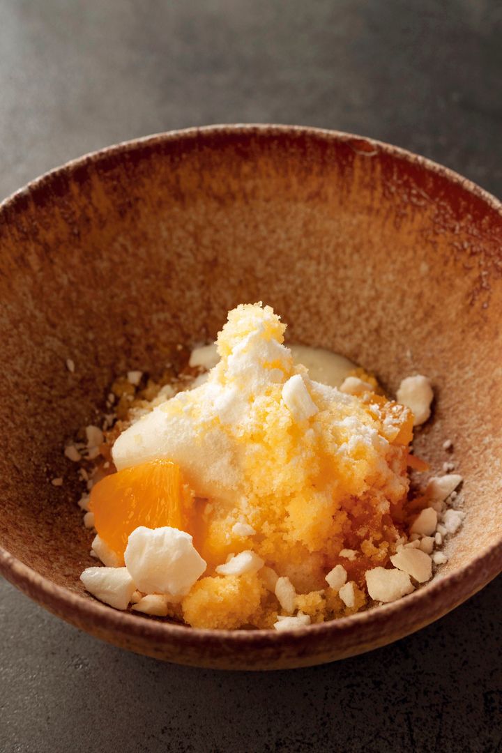柑橘の一種「不知火(しらぬい)」はカモミールのシャーベット、パンナコッタとともに。宏奈さんは食後でも無理なく楽しめる、ほどよい甘さとボリュームを意識しているという。 撮影=前川明範