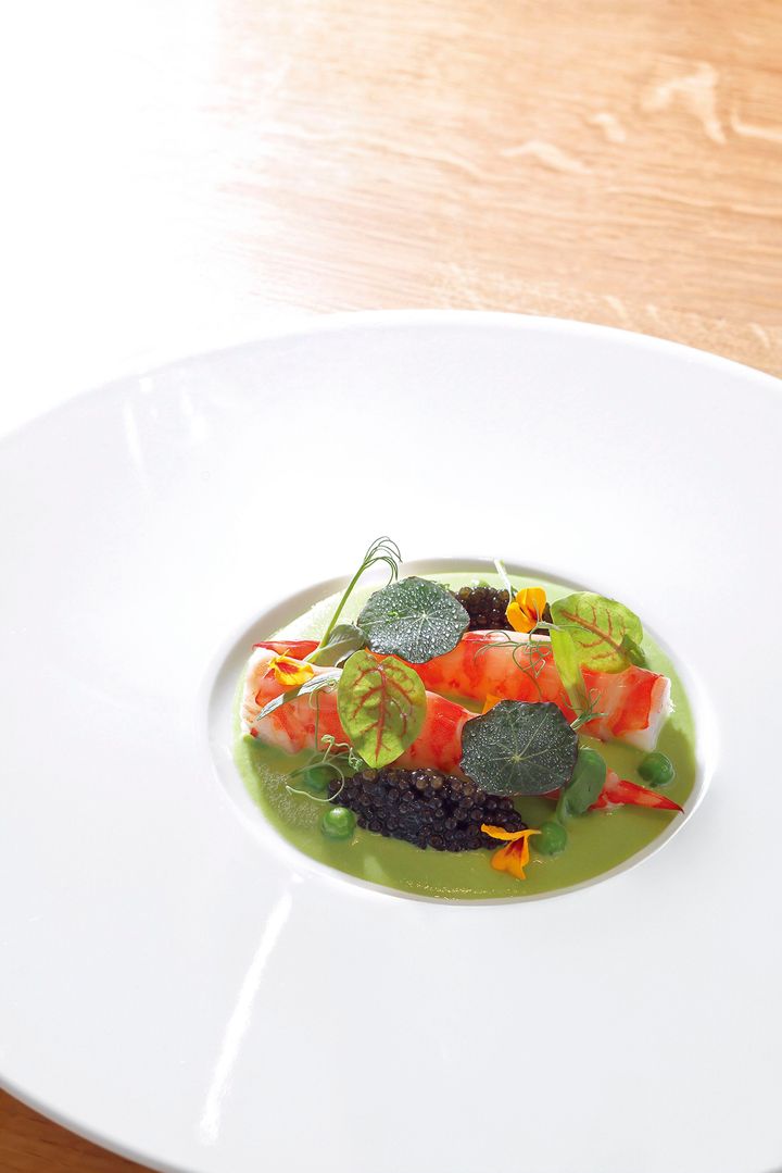 上品な甘みが特徴の車海老を、存在感のあるキャビアとグリーンピースのシンプルなソースで味わう軽やかな前菜。 撮影=高嶋克郎