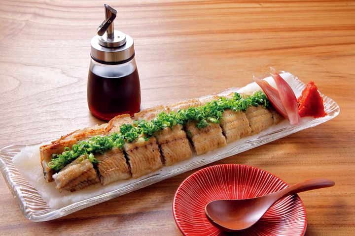 鰻のたたきポン酢4,500円。白焼きに大根おろしとねぎを合わせ、ポン酢でいただくさっぱりした一品料理。大ぶりの「葵うなぎ」は複数人で取り分けるのに最適。 撮影=高嶋克郎