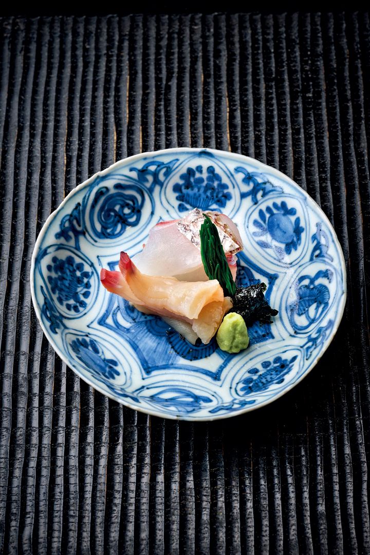 造りの本みる貝、鯛はいずれも三河産。おかひじき、海苔、わさびを添えて、明の芙蓉手に盛った。 撮影=阿部 浩