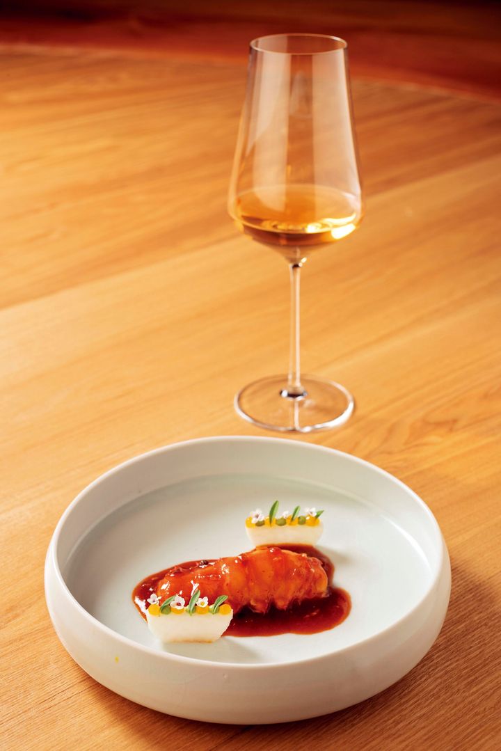 伊勢海老は海老チリ風のソースで新鮮な味わいに。アルコールはもちろん創意工夫を凝らしたノンアルコールペアリングもおすすめ。 撮影=前川明範