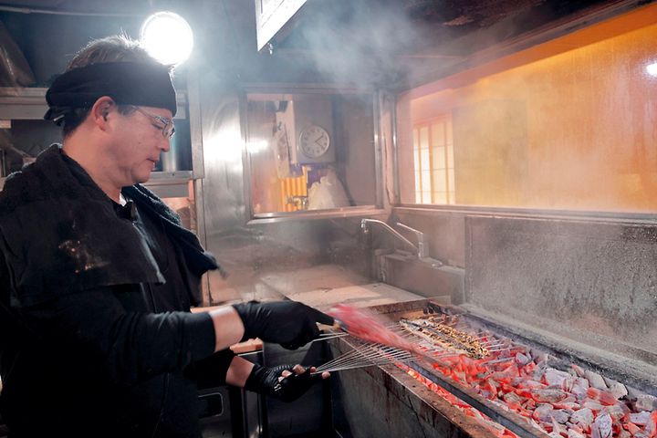 店主の柴田哲滝さんはうちわで火加減を巧みに調整して焼き上げていく。 撮影=高嶋克郎