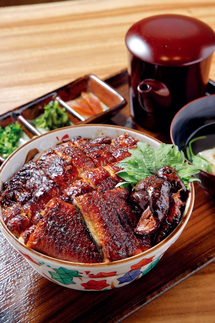 しば福丼4,100円。ひつまぶしと、蒲焼き、砂肝焼きが一緒になった多様な味わい方が叶う看板メニュー。最後はたっぷりの出汁とともに、お茶漬けで鰻をいただく。 撮影=高嶋克郎