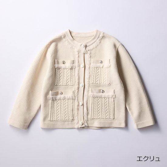 ツィード風のざっくりとしたテクスチャーのある編み地にフリンジをあしらい、品のある落ち着いた金ボタンを施した、きちんと見えしてデイリーにも使えるニットジャケット。華やかな雰囲気で、ハレの日の高揚感もさらにアップ!きちんと見えしながらもニット素材なので、柔らかく動きやすく、1日来ていてもお疲れ知らずです。