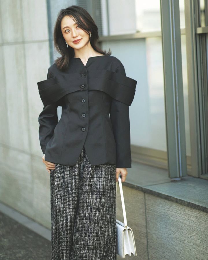 ジャケット¥10,980パンツ¥6,980(ともにべベッド)ブラウス¥17,600(ジャスグリッティー/ジャスグリッティー プレスルーム)バッグ¥68,200(メゾン カナウ/ヤマニ)シューズ¥19,250(ダイアナ/ダイアナ 銀座本店)ピアス¥17,600(シトラリー)