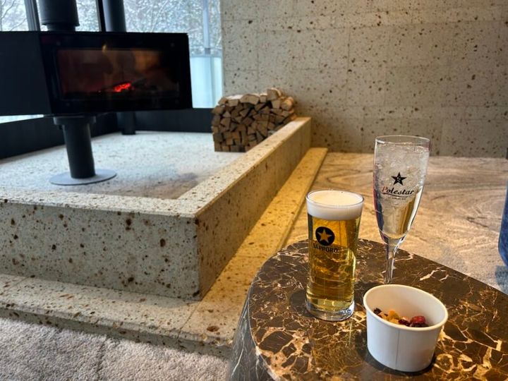 ラウンジの暖炉の前は、ゆったりと腰掛けられるふたりがけのソファ席。ゆらめく炎のぬくもりに身を委ねながら、スパークリングワインやビールを楽しみました。ドライフルーツやナッツ、チョコレートといったおつまみは常時楽しめ、16時〜18時にはピクルスなど、アペロ感覚で味わえる軽やかな一品も並びます。同じラウンジでも、時間帯が変われば窓の外の景色も、グラスの中の余韻も少しずつ表情を変えていきます。