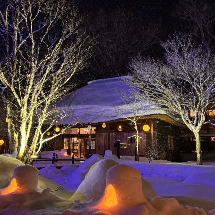 ホテルに戻る途中にある「平家の里」も、ぜひ訪れたい夜景スポット。湯西川の地に身を隠して暮らしたという平家一門にまつわる秘話や伝説を後世にのこすべく、かやぶき屋根の屋敷が立ち並びます。当時の暮らしが再現されるとともに「かまくら祭」に合わせて、平安時代のきらびやかな陛下の暮らしをイメージした「平家あかり」も同時開催されています。竹燈籠や竹鞠の灯りがファンタジックでタイムスリップしたかのよう。
