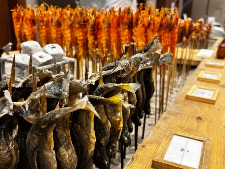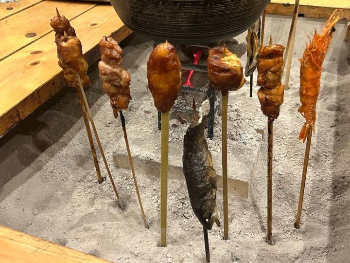 2階にあるレストラン「燎(かがりび)」で味わえるのが、宿の名物「ごちそう里山ビュッフェ」。栃木県産の鶏や岩魚、えびなどを使った串は、囲炉裏を囲む各席へ運び、炭火で仕上げるスタイルです。素材はあらかじめ火入れされているため、軽く温めるだけで、ほくほくとした食感と旨みが立ち上がります。